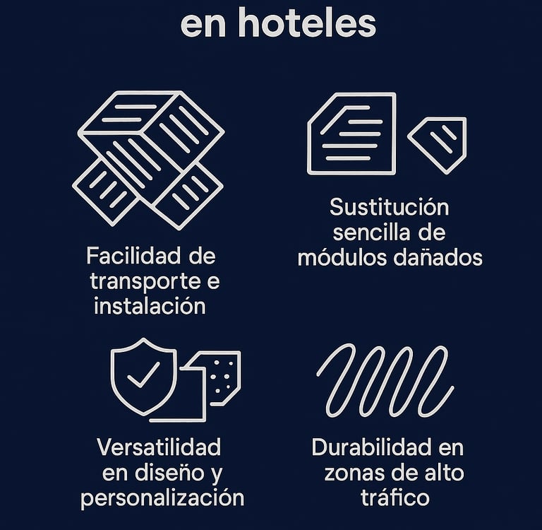 Una de las ventajas más apreciadas por los administradores hoteleros es la posibilidad de reemplazar solo los módulos afectados por manchas, desgaste o daños, sin necesidad de cambiar toda la superficie. Esto no solo ahorra dinero en mantenimiento, sino que también garantiza que los espacios se mantengan siempre en condiciones óptimas frente a los huéspedes.