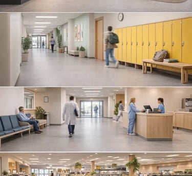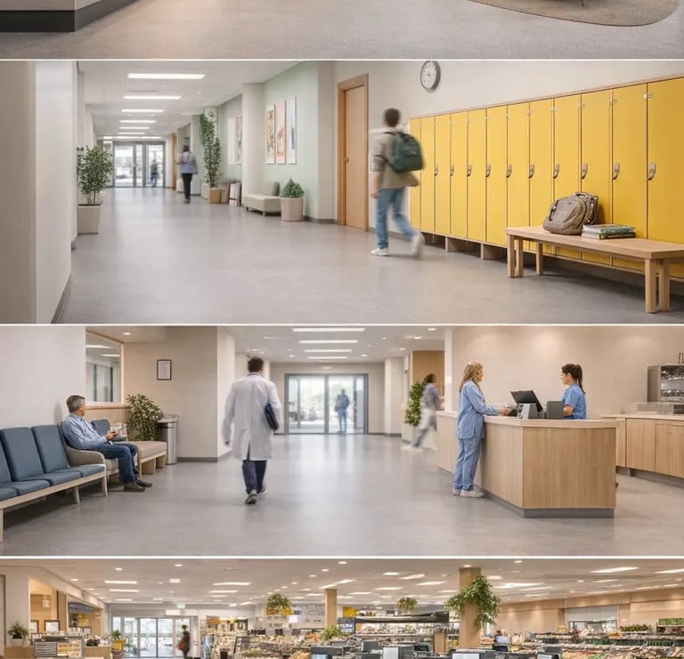 Áreas de alto tránsito en oficinas, ideal para pasillos, recepciones y zonas de circulación constante.