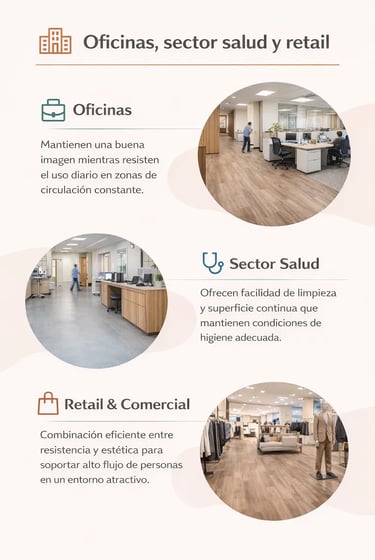 En oficinas y espacios corporativos, estos pisos permiten mantener una buena imagen del entorno mientras resisten el uso diario en zonas de circulación constante. Son especialmente útiles en áreas como pasillos, recepciones y espacios operativos donde el tránsito es continuo.