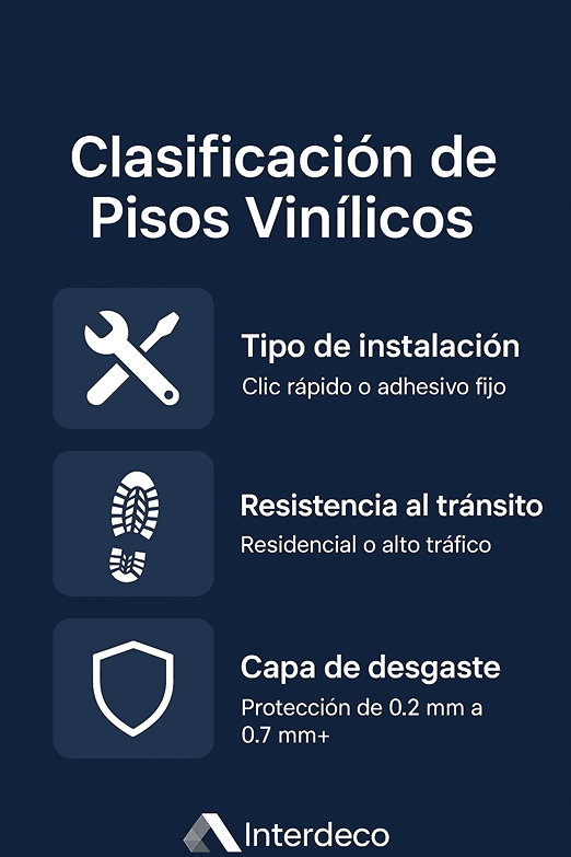 Este criterio evalúa la manera en que se colocan los pisos. Los sistemas de clic permiten una instalación rápida, limpia y sin adhesivos, ideal para remodelaciones o cambios frecuentes en oficinas y áreas comerciales. Por otro lado, los pisos vinílicos que requieren adhesivo proporcionan mayor fijación y estabilidad, fundamental en zonas de alto tránsito. Elegir correctamente el tipo de instalación impacta directamente en la durabilidad y en el costo total de la obra.Pisos vinílicos según resistencia al tránsito:
